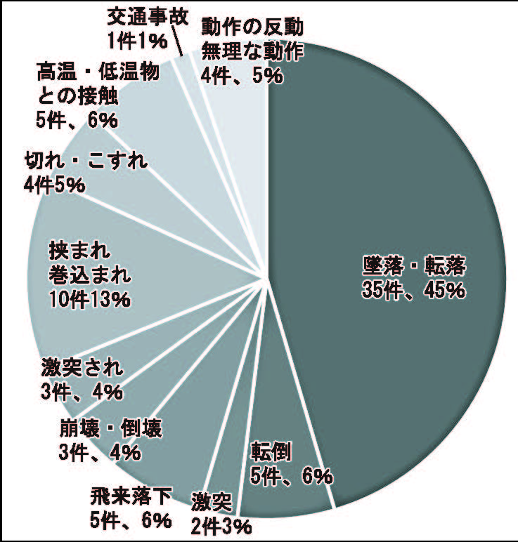 2020年における建設業の休業4日以上の労働災害の事故型別では、「墜落・転落」が全体の45%(77人中35人)を占め最多。中でも脚立・はしご、足場、建築物・構造物などで発生。脚立などの安全な使用、足場の整備、墜落防止措置が求められる。フルハーネス型など墜落制止用器具の機能が進化してきているとはいえ、墜落防止対策の原則は手すり・囲い・覆いなどである。あくまで、設備面での対応であることを忘れないでいただきたい。このほか、「転倒」6%、「激突」3%、「飛来落下」6%、「崩壊倒壊」4%、「激突され」4%、「挟まれ・巻き込まれ」13%、「切れこすれ」5%などが挙げられる。このうち「挟まれ・巻き込まれ」は車両系建設機械、移動式クレーン、動力運搬機械が関係する災害が散見される。