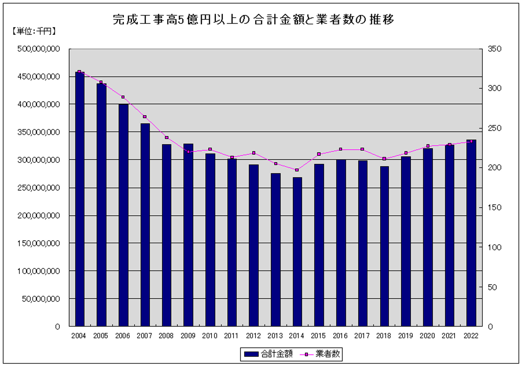 完工高5億円以上の企業数は、2006年に300社を割って以来、徐々に減少し続け、14年には200社も割り込んだ。それ以降は200社台をキープしながら徐々に増加し、今回233社で08年並みの水準となった。