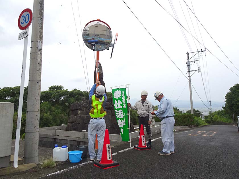 雲仙市商工会建設部会/地元小中学校付近のカーブミラー清掃/29社47人がボランティア活動