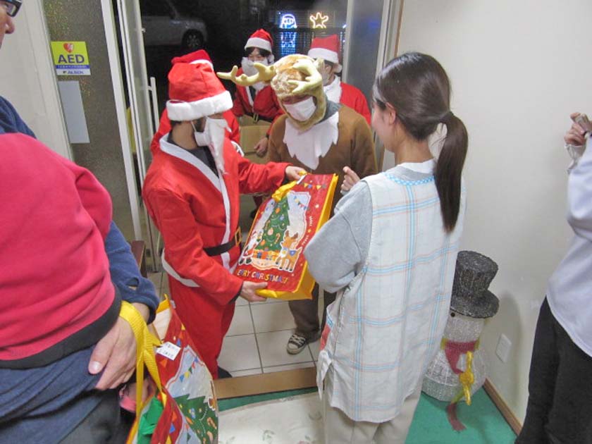 7回目となる今年の活動では、サンタクロースなどに扮した社員が3班に分かれて、本園と分園、地域小規模ユニットの児童・生徒38人(幼児~大学生)に、本人の希望を踏まえたクリスマスプレゼントとケーキ、シャンメリーを手渡しました。職員の方々にもケーキをプレゼントしました。