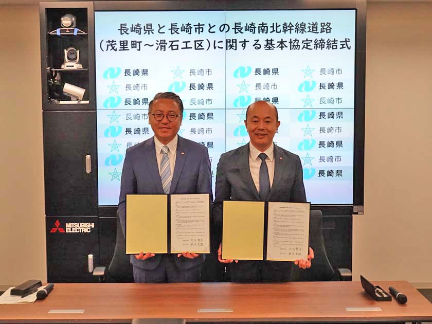 高規格道路のうち、長崎南北幹線道路は、長崎市茂里町から滑石間の詳細設計が完了し、昨年10月に長崎市との間で用地取得等における協力事項を定めた基本協定を締結(=写真)し、本格的に用地取得に着手したところ。