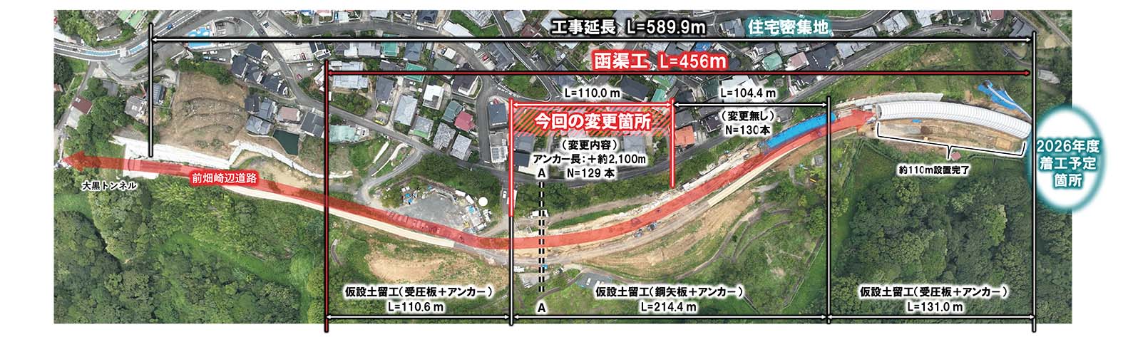 佐世保市前畑崎辺道路整備/地盤を追加調査・アンカー長を再検討/本年度の事業費を減額し来年度へ