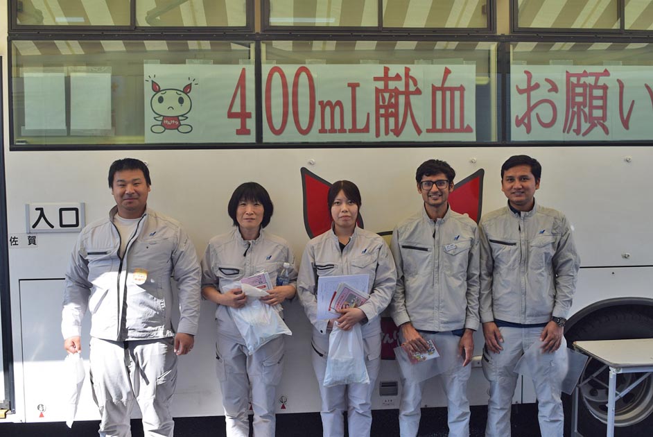 当日は、嘉瀬川沿いの会場に献血バスを招いた。事前にチラシを配布するなどして告知したところ、次々と協力者が訪れ、400㍉㍑献血を行った。8月から㈱上滝建設で働くネパール出身のプラベグ・アチャリヤ氏、ビバス・カルキ氏も参加した。