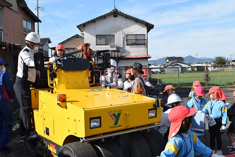 同社は佐賀市久保田町で「令和7年度嘉瀬川徳万地区堤防強化工事」を施工している。当日は現場事務所の敷地内にバックホウ、タイヤローラー、ロードスイーパーを並べ、園児たちを出迎えた。