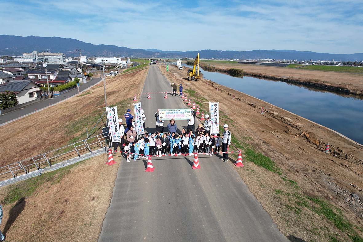 見学会には発注者である佐賀河川事務所嘉瀬川出張所の德永久美惠所長も立ち会い、園児たちと交流。同社の取り組みについて「子どもたちが楽しみながら公共事業の役割を知るきっかけをつくってくれてありがたい」と述べた。