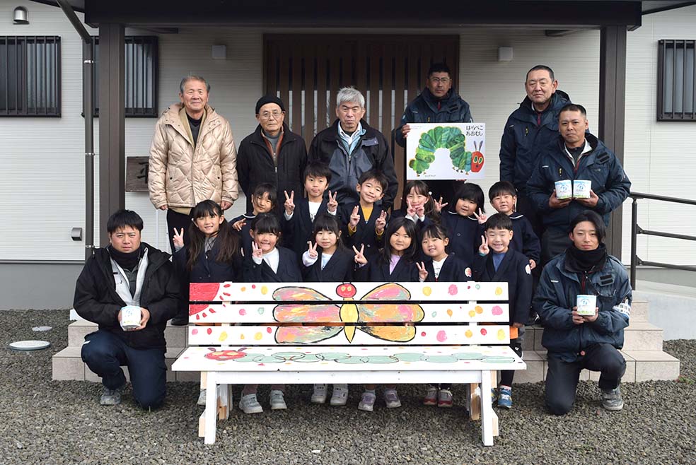 21日に、田島和也氏(監理技術者)、土井一成氏(現場代理人)、真島颯大氏(現場技術者)らが完成したベンチを地区公民館に届け、地区関係者と園児が出席して贈呈式が行われた。田島氏は「工事でお世話になった地域の皆さんに、何か形に残るものを届けたいと考えた。協力してくれた年長組の皆さんにとっても、卒園の良い思い出になればうれしい」と話した。